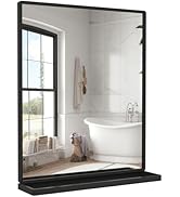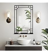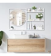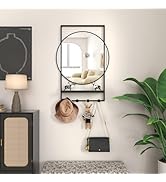 The WONSTART Wall Mirror is a 21x28 inch rectangular mirror featuring a unique embedded round mirror, crafted with high-definition glass for crystal-clear reflections. Its matte black metal frame is waterproof and rustproof, ensuring durability and a modern aesthetic. Equipped with a bottom shelf and five sturdy hooks, it offers versatile storage for entryways, bathrooms, or bedrooms. Easy to install with included mounting hardware, this mirror blends functional organization with contemporary design to elevate any living space.